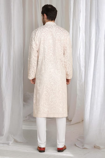 Pastel light pink kurta featuring intricate thread embroidery.
