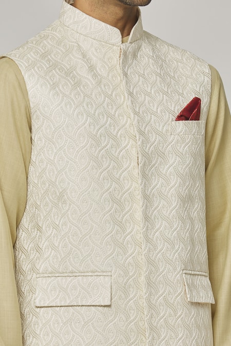 Cream bundi featuring floral embroidery and concealed placket. Paired with a full sleeve kurta and pyjama.