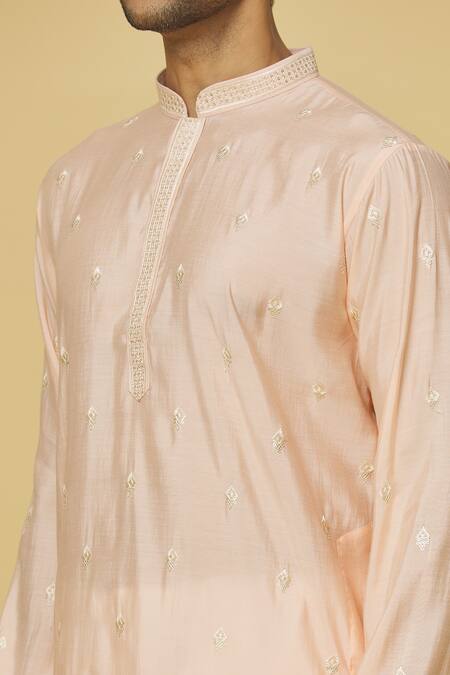 Pink kurta featuring floral butta embroidery, side slits, and a mandarin collar. Paired with a matching pyjama for a complete look.