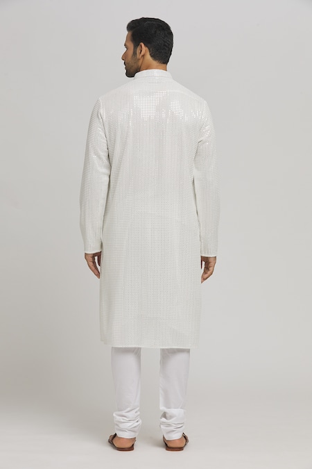 White cotton kurta featuring mirror and thread embroidery with a mandarin collar. Paired with a churidar for a complete look.