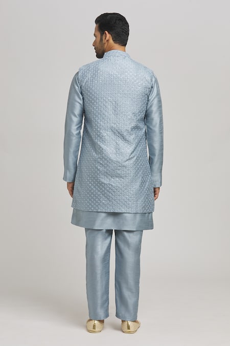 Pastel blue kurta set featuring a mandarin collar kurta with full sleeves and front button closure. Paired with a sleeveless jacket adorned with thread embroidered sequin jaal patterns and matching pants.