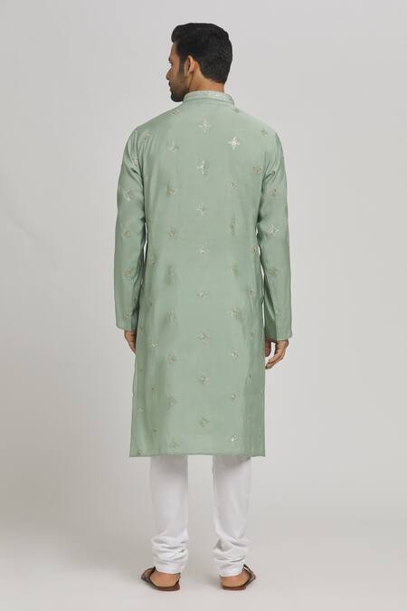 Pastel green kurta featuring thread embroidered geometric patterns and sequin embellishments. Paired with a matching churidar designed for comfort and style.
