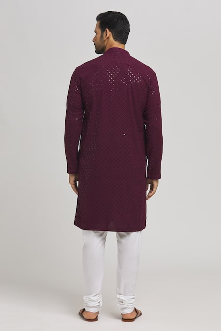 Dark maroon kurta featuring a mandarin collar with mirror and thread embroidered geometric patterns. Paired with a matching churidar for a complete look.