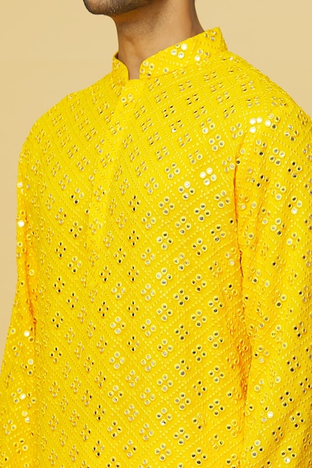 Yellow kurta featuring mirror embroidery and a mandarin collar. Paired with a matching pyjama with an elastic waistband.
