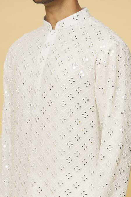 White kurta featuring mirror embroidery with full sleeves and a mandarin collar. Paired with a matching pyjama and designed with concealed placket detailing and side slits.