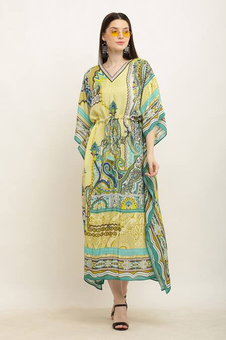 Buy_Aham-Vayam_Multi Color Modal, Silk V-neck Paisley Print Drawstring Waist Kaftan_Online_at_Aza_Fashions
