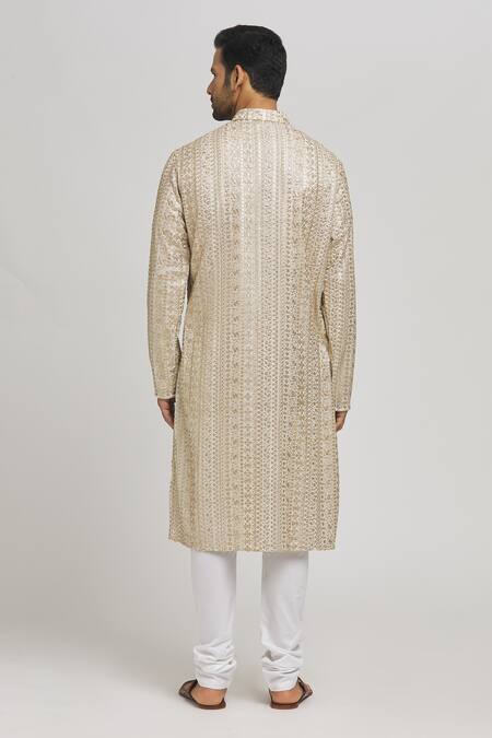 Ivory cotton kurta featuring full sleeves, mandarin collar, and intricate sequins and thread embroidery. Paired with a churidar for a complete look.