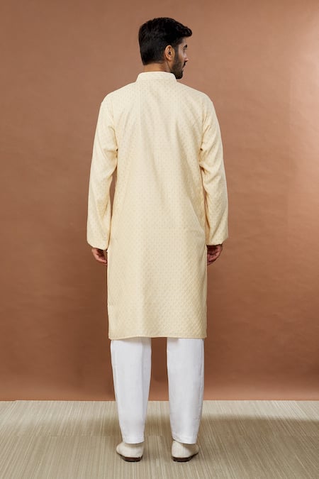 Beige kurta in silk cotton featuring a Mandarin collar and full sleeves. Paired with a drawstring front pyjama.