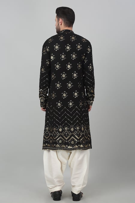 Black kurta featuring floral pattern with metallic sequins and tonal thread embroidery. Paired with a contrast cowl draped patiala pant with an elasticated waistband.