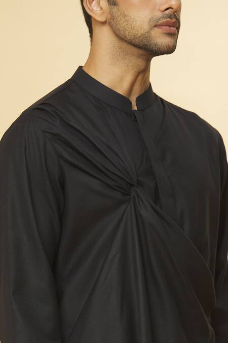 Black cotton kurta featuring a mandarin collar and full sleeves with an asymmetric hemline. Paired with a matching pyjama, this set includes intertwined detailing on the kurta.
