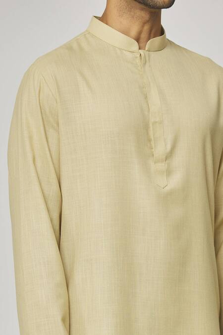 Beige cotton kurta featuring a mandarin collar and full sleeves with an asymmetric hemline. Paired with a matching pyjama for a complete look.