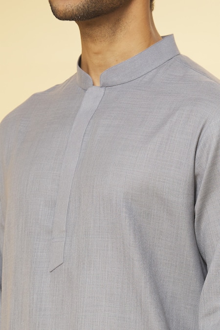 Grey cotton kurta featuring a mandarin collar and full sleeves with an asymmetric hemline. Paired with a matching pyjama.