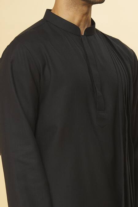 Asymmetric black kurta featuring pleated panel detailing and side slits. Paired with a matching pyjama for a complete look.