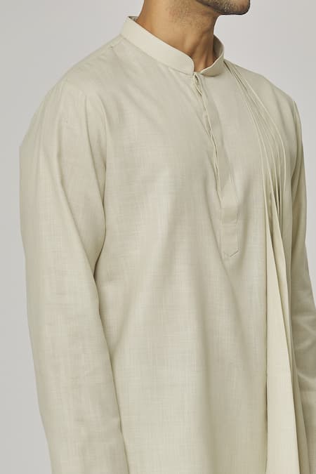 Cream gathered kurta featuring a mandarin collar and asymmetric hemline. Paired with a matching pyjama made from cotton fabric.