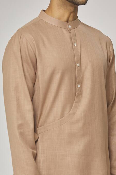 Brown solid cotton kurta featuring a band collar and full sleeves. Paired with a matching pyjama, the kurta has a front button closure and a side tie-up detail with an asymmetric hemline.