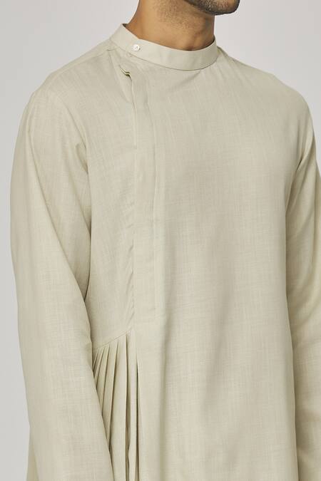 Cream cotton kurta featuring an asymmetric hemline and a band collar. Paired with a matching pyjama for a complete look.