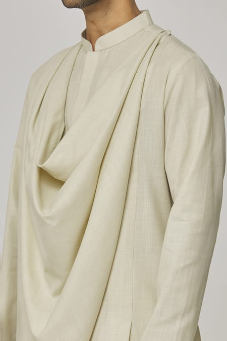 Cream asymmetric kurta featuring draped detailing and side slits. Paired with a matching pyjama for a complete look.