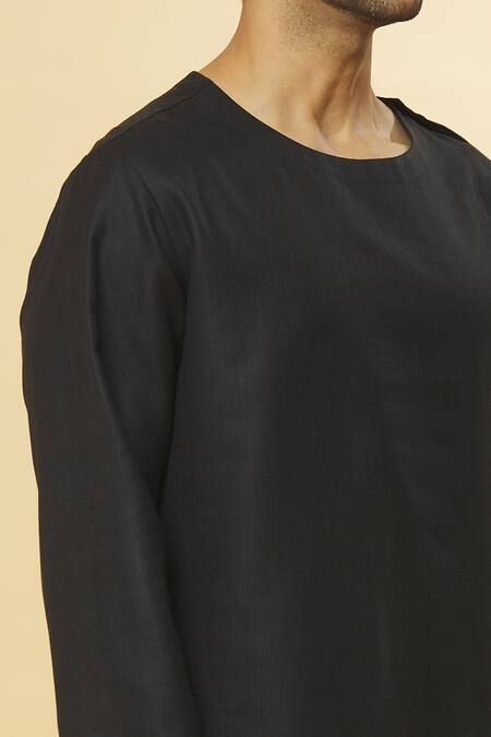 Black cotton kurta featuring a double asymmetric hemline and round neckline. Paired with matching pyjama for a complete look.