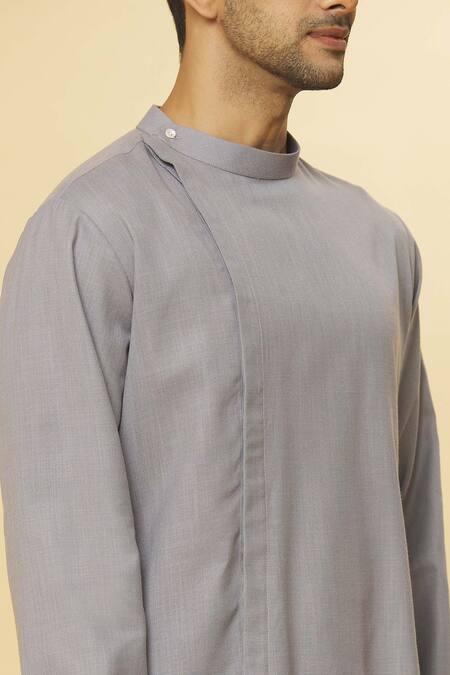 Grey cotton kurta featuring an asymmetric hemline and full sleeves. Paired with a matching pyjama.