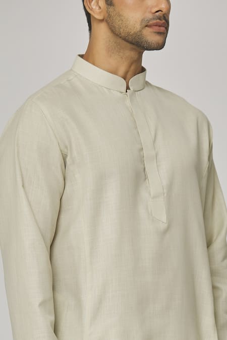 Cream kurta featuring a mandarin collar and full sleeves with an asymmetric hemline. Paired with a matching pyjama for a complete look.