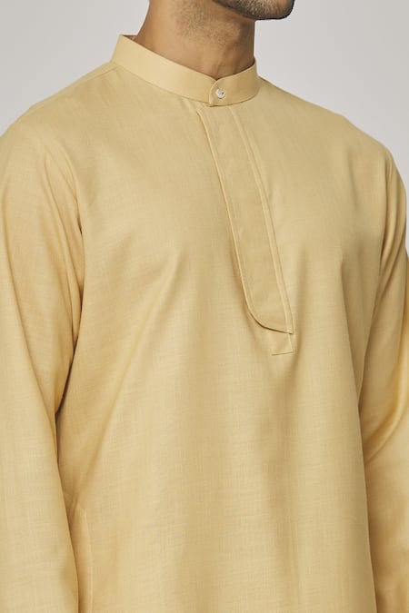 Dawn yellow cotton kurta featuring a band collar and full sleeves. Paired with matching pyjama, it has an asymmetric hemline and front button closure.