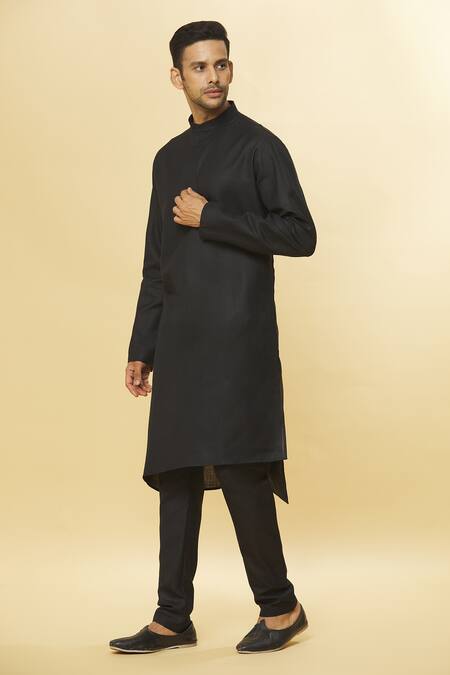 Black cotton kurta featuring a band collar and full sleeves with an asymmetric hemline. Paired with a matching pyjama for a complete look.