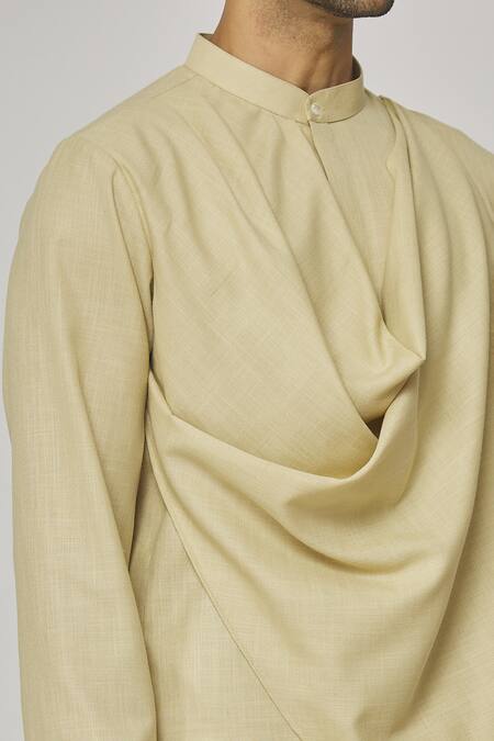 Beige gathered kurta featuring a band collar and asymmetric hemline. Paired with matching pyjama.