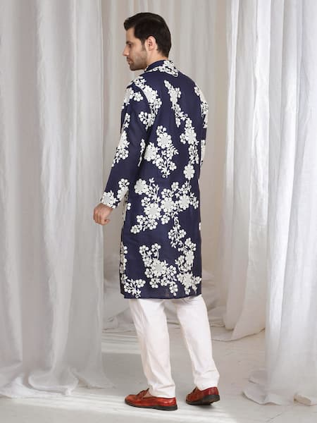 Ink blue kurta made from cotton linen featuring intricate thread embroidery.