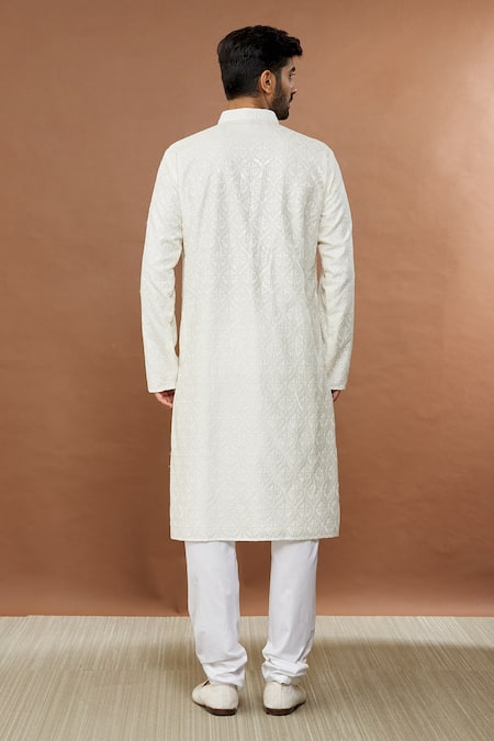 White kurta featuring floral geometric embroidery highlighted with sequins. Paired with a matching churidar for a complete look.