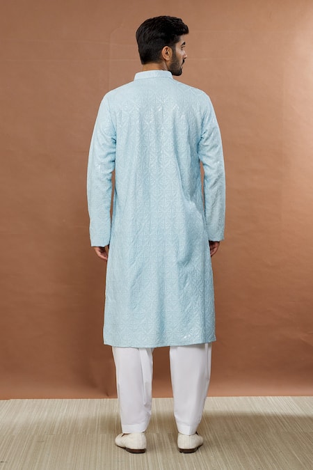 Dusty blue kurta featuring floral geometric embroidery with sequins. Paired with a matching pant for a coordinated look.