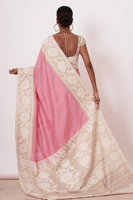 Onion pink banarasi saree with big beige border. Comes with a cream blouse with all over zari embroidery in gold.