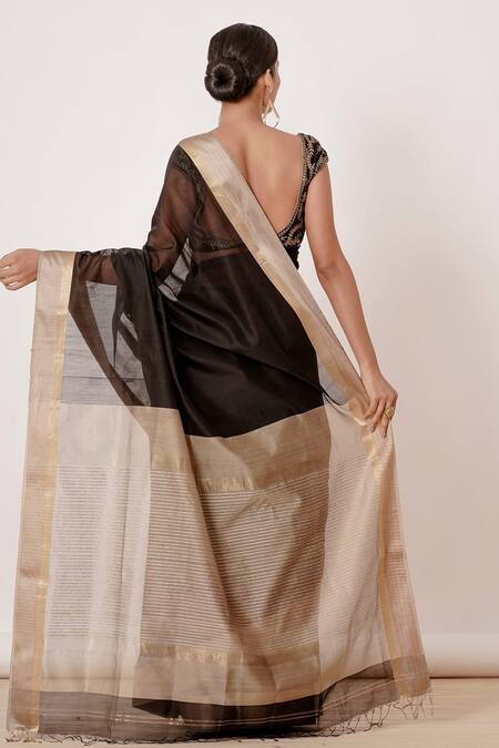 Plain royal black Maheshwari silk saree with beige and gold border. Comes with blouse with zari embroidery all over.