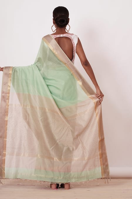 Back cut-out blouse, Threaded fringed hem saree, Handwoven