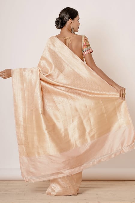 Light peach pure banarasi silk saree has all-over tonal intricate zari work. Comes with blouse with floral jacquard all-over.