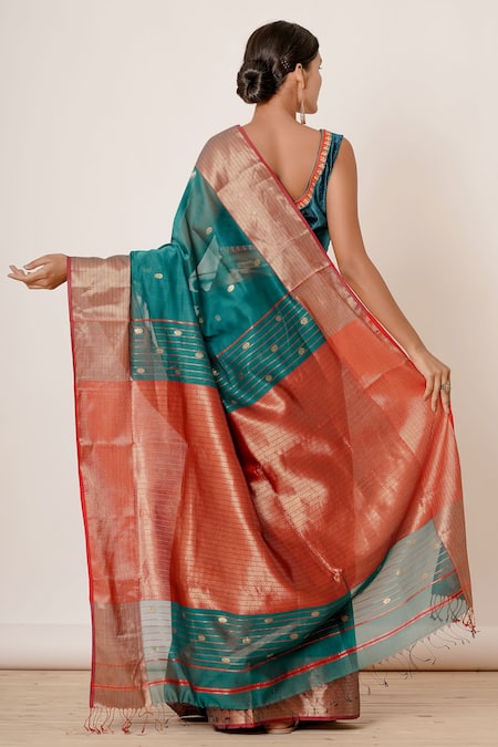 Blue Pure Handwoven Chanderi Lining Cotton And Shantoon Saree With Blouse