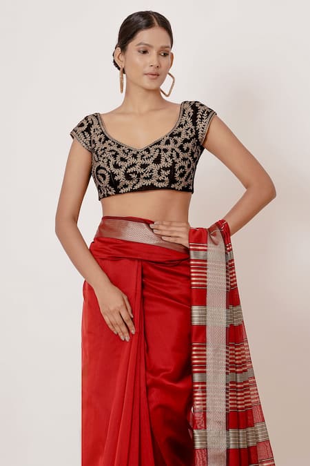 Chilli red saree with chevron striped border. Comes with brown blouse with zari embroidery.