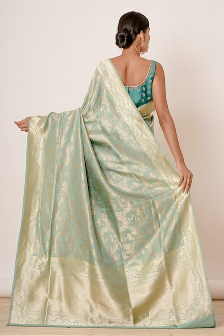 Light turquoise pure Banarasi saree with flamingo and floral woven motifs. Comes with paisley woven motifs blouse.