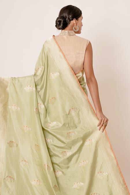 Pista green Banarasi silk saree with woven paisley motifs and a thick intricate border in zari. Comes with a gold blouse with embroidery around the neck.