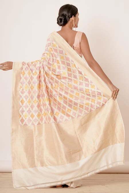 Ivory Banarasi silk saree with pastel coloured motifs all-over and intricate border. Comes with a peach sleeveless blouse.