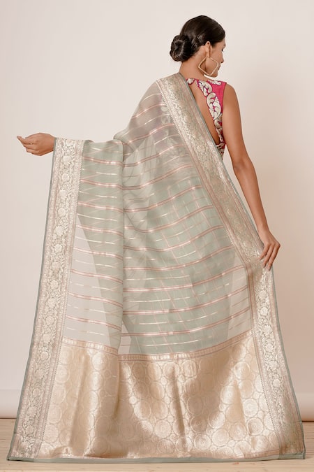 Light turquoise pure Banarasi organza silk saree with woven stripes and floral motifs on the border. Comes with bright fuschia pink blouse.