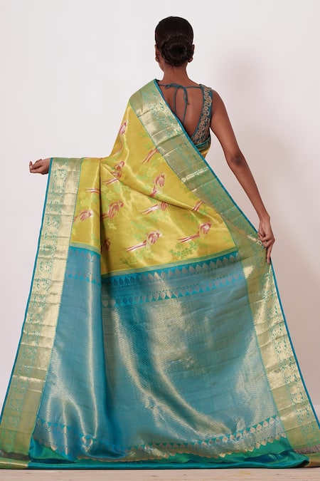 Light parrot green dharamavaram silk saree with thick blue intricate zari border with parrot buttas all over. Comes with a teal blouse with all over zari embroidery.