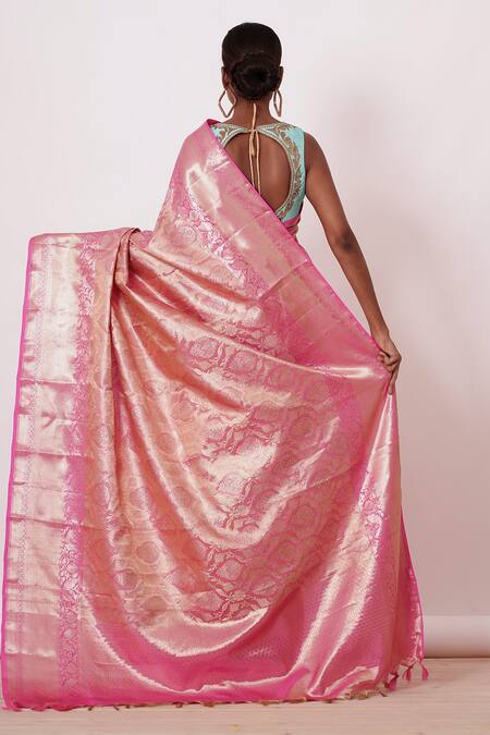 Onion pink dharamavaram silk saree with thick intricate zari border with all over jacquard. Comes with a turquoise blouse with all over zari embroidery.