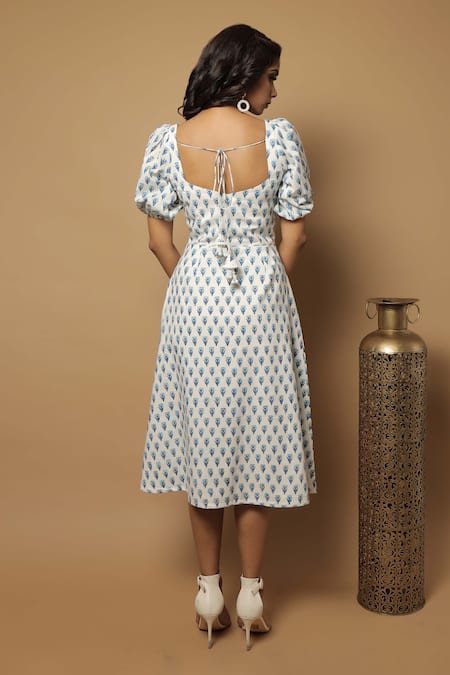 Off white A-line midi dress with blue block printed motifs and elbow length balloon sleeves.