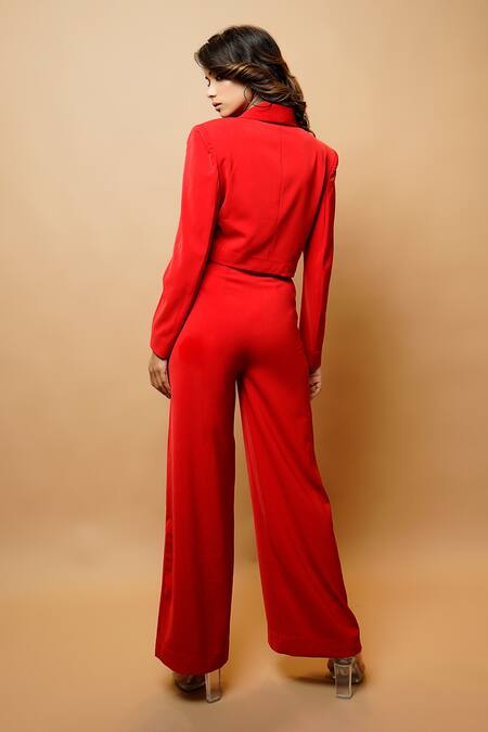 Hot red cropped blazer with zardozi, stone and cutdana embroidery on the collar. Comes with front slit pant with pockets.
