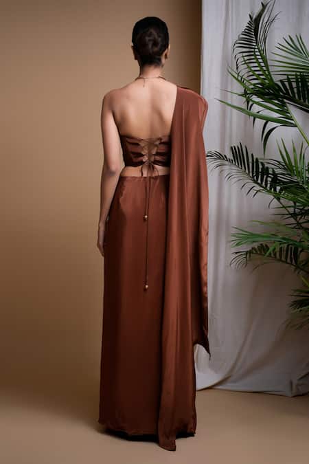 Brown Crepe Mirrors, Zari, Cut Work, Embellished Corset With Draped Skirt