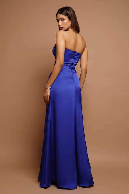 Buy_Ahi Clothing_Blue Satin Sweetheart Neck Knotted Draped High Slit Dress _Online_at_Aza_Fashions