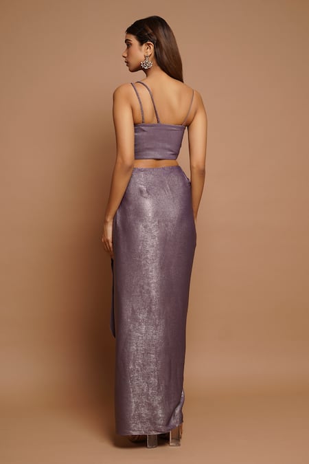Buy_Ahi Clothing_Purple Lycra V-neck Metallic Pleated Draped Dress _at_Aza_Fashions