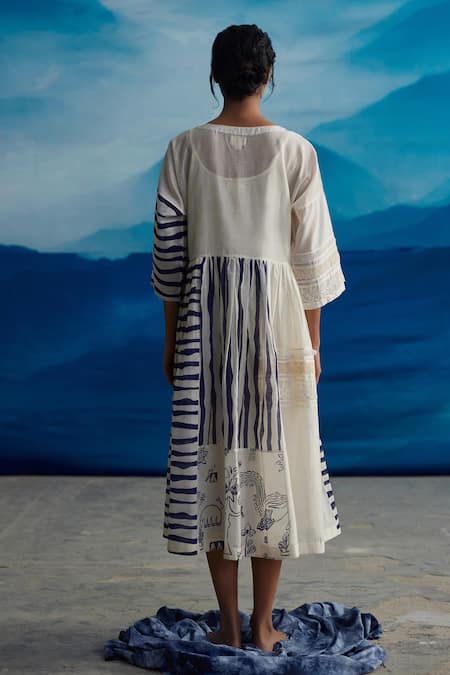 Ivory Chanderi, Cotton Boat Neck Delphine Patchwork Printed Dress