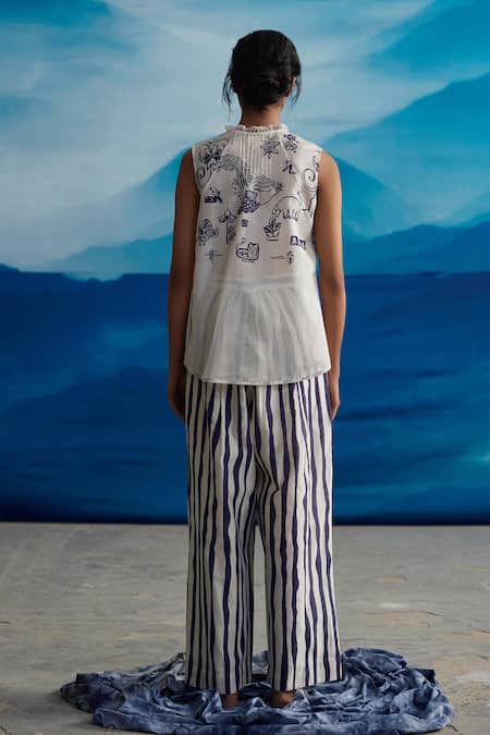 Ivory shirt featuring a floral, cat, and stripe placement print with pintuck detailing
