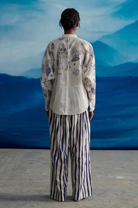 Ivory shirt featuring abstract, floral, and animal prints with lace embellishments on the placket
